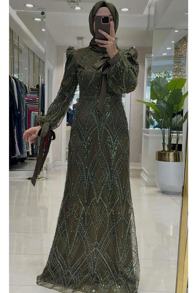 Geceye imzasını atmak isteyenler için: İncili Ülkü Abiye. Haki tonunun büyüleyici etkisi, usta kalıplarla birleşerek ortaya şıklık ve konforu aynı anda sunan bir sanat eseri çıkarıyor.